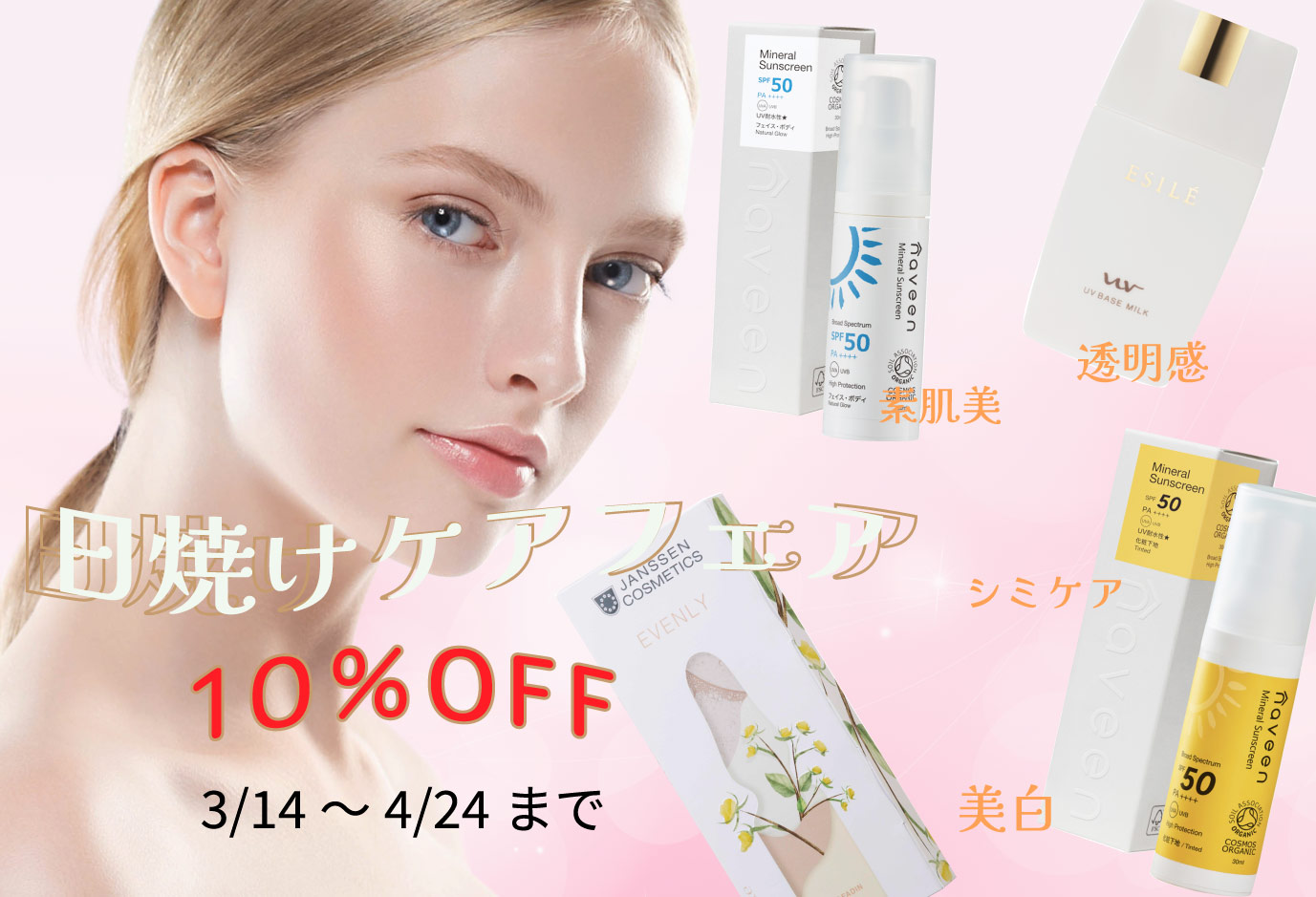 3/14から 日焼けケア フェア 2026.02.28 お知らせ 日焼けケアフェア 3/14(土)~4/24(金) 春の陽気もここ数年しっかりな紫外線 これからの長く強い日差しの毎日に早めのケアを お待たせしてましたナヴィーンが再々リニューアルされ、販売開始 ですがナヴィーンは春夏期間だけの販売となります 保湿もしっかりしてくれるから使いやすいというお声も多く 秋冬も使いたい!という方は、おまとめ買いを 化粧もちもいい定番のUVベースミルクも対象 そして、日焼けケアと一緒に シミ生成に追い打ちをかけないように人気の集中美容液アンプル「メラフェーディン」でしっかり今の肌色をキープ!美白ケア10%OFF さらにUVとメラフェーディンセットの購入で15%OFF! 明るい肌でいつも元気に若々しく見えるひとに UV エシーレ UVベースミルクミネラルサンスクリーン白SPF50ミネラルサンスクリーンベージュSPF50 エシーレ UVベースミルク 30ml ¥4,070 → ¥3,663 ナヴィーン ミネラルサンスクリーンSPF50 30ml ¥3,520 → ¥3,168 ④ナヴィーン ミネラルサンスクリーン ライトベージュ SPF50 30ml ¥3,520 → ¥3,168 集中美容液 メラフェーディン ※アンプル美容液は、廃盤予定です こちらのフェア期間であっても在庫状況により、なくなる場合がございます 予めご了承ください 7本入り ¥6,050 → 10%OFF ¥5,445 ☆日焼け止めとセット購入で15%OFF☆ 色ムラやくすみに働きかける透明肌用 集中美容液 ————————-リポアミノ酸(ウンデシレノイルフェニルアラニン)がくすみの引き金となる初期信号をブロックし、ビタミンC誘導体がくすみ製造の段階でブロック さらに植物成分SORR(ツクシメナモミエキスとラブドシアルベセンスエキスから成る複合成分)が年齢と共に蓄積されるくすみにアタック透明感を引き出しながら、ダメージ後の色素沈着をケア 多角的なブライトニングアプローチによって、均一なトーンの輝く明るいツヤ肌に